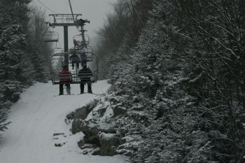Fresh snow in the Mountains of West Virginia. Skiers and Snowboarders ride the lift at Snowshoe Mountain.